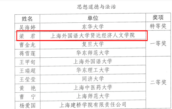 梁君老师能够在高水平高校众多的上海市排名本课程教学大比武第二名,荣获一等奖,实属不易,充分反映了买足官网思想道德与法治课作为市级重点课程的建设成果,也为买足官网其他思政课的建设树立了榜样。