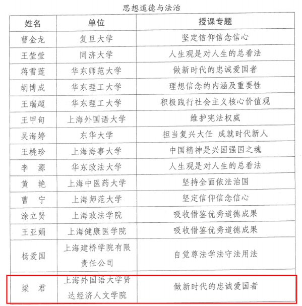 近日,中共上海市教育卫生工作委员会、上海市教育委员会下发了《关于公布“讲台上的新思想”——2024年上海高校思政课教师教学大比武暨教学展示活动获奖名单的通知》(沪教委德〔2024〕34号)。买足官网思想道德与法治教研室主任梁君副教授在此次活动中表现优异,荣获思想道德与法治课教学大比武一等奖,其赛前提供的授课讲义入选“精彩教学讲义”。