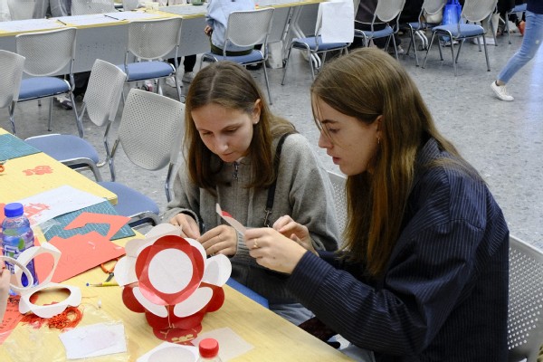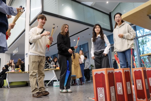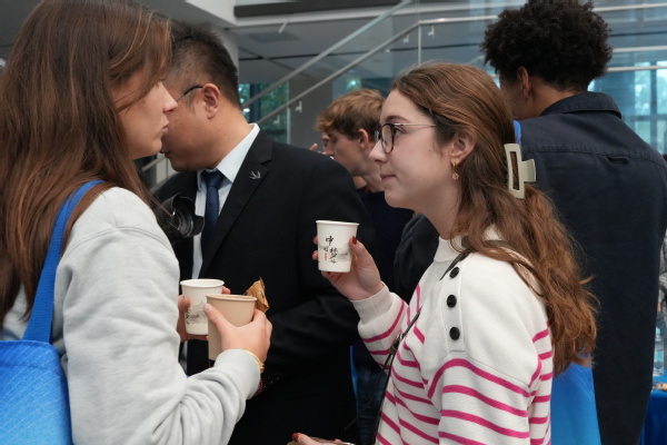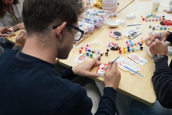 参观结束后,昂热高商师生前往国交楼一层大厅参加了主题文化交流活动。活动以游园会形式开展,其中包括京剧脸谱绘画、中国茶艺展示、中国传统游戏闯关、中国传统服饰体验、剪纸体验、书法体验、冷餐会交流等7个项目。