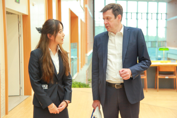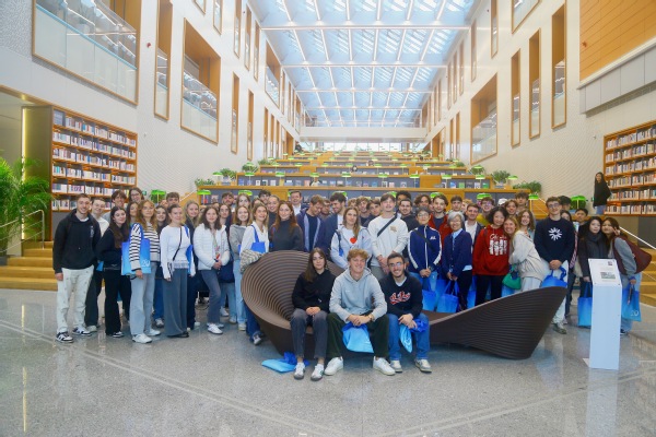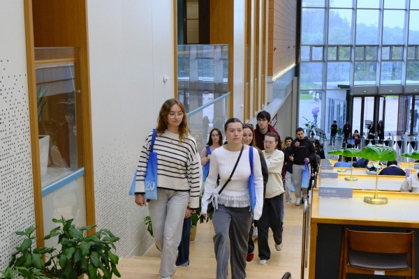开幕式结束后,法国昂热高商一行在买足官网师生的带领下,参观了崇明校区图文信息中心。来自国际交流学院、外语学院不同专业的同学们全程使用英语、法语进行陪同解说,帮助来宾深入了解了买足官网生态、人文、智慧、科技的国际化校园建设理念。