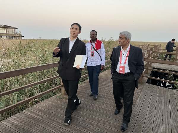 随后,考察组一行前往东滩湿地公园。两位同学轮流为外方专家翻译解读了东滩湿地公园内水涉禽招引区、湿地生境修复区等参观点位的设计理念与内涵;同时,还协助中西方学者进行学术探讨,确保了调研考察活动的顺利进行。