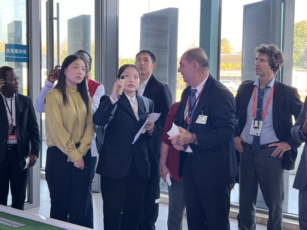 在崇明陈家镇的璞叶小镇。两位同学凭借准确而流畅的英语表达,向外籍专家们详尽阐述了该园区独特的“渔光互补”能源经济系统,以及它作为集科普教育、观光旅游与休闲渔业于一体的综合性产业园的鲜明特色。在问答互动环节中,两位同学更是发挥了桥梁作用,帮助外方专家与中文讲解员完成了有效的沟通。