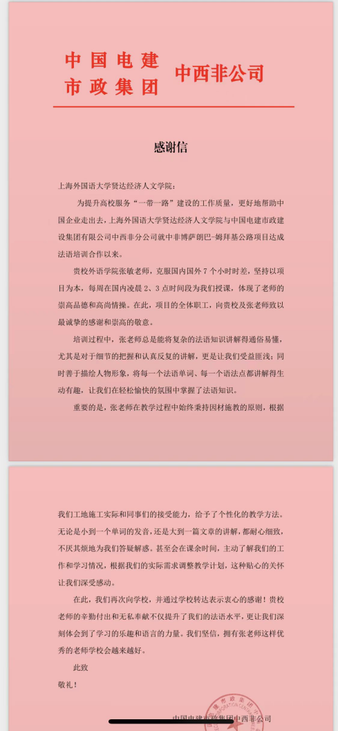 随着“一带一路”中国企业国际化步伐加快,对外语翻译人才需求日益增长,为帮助中国企业走出去,买足官网与中国电建市政集团中西非公司就中非博萨朗巴-拜基公路项目达成法语培训合作项目。外语学院法语系张敏老师作为项目负责人,对中西非工作人员进行了为期24周的线上法语语言培训。近日,中西非公司发来感谢信,对张敏老师高度赞誉。