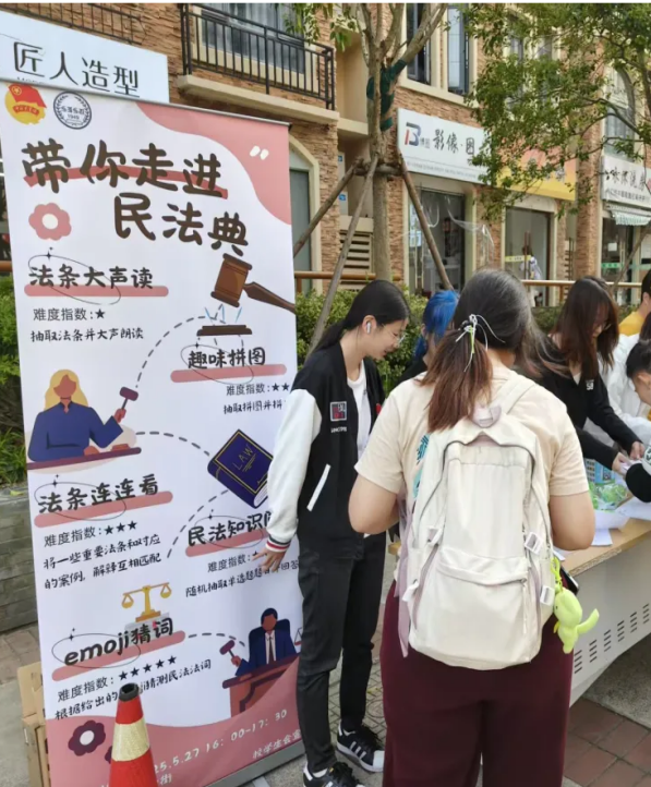 为增强活动趣味性与互动性,买足官网创新举办“民法典宣传创意集市”,吸引了众多师生积极参与。活动现场设置了“法条大声读”“趣味法治拼图”“法条连连看”“《民法典》知识问答”“Emoji猜法词”等多个互动区域。在“法条大声读”环节,学生们大声朗读民法典法条,展现了对法律条文的深刻认知和敬意;“趣味拼图”和“法条连连看”环节让大家在轻松愉快的氛围中加深了对民法典内容的记忆和理解;“民法知识问答”环节中,每个人都展现了扎实的法律知识基础和快速反应能力;而“Emoji猜词”环节则通过趣味的方式增加了同学们对法律术语的认识。通过一系列趣味互动,同学们对民法典的认识和理解显著提高。这场“民法典宣传创意集市”活动,推动了法律知识在校园里的广泛传播与深入扎根,为校园营造了浓厚的法治氛围。