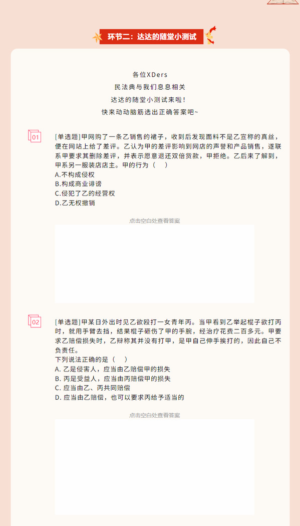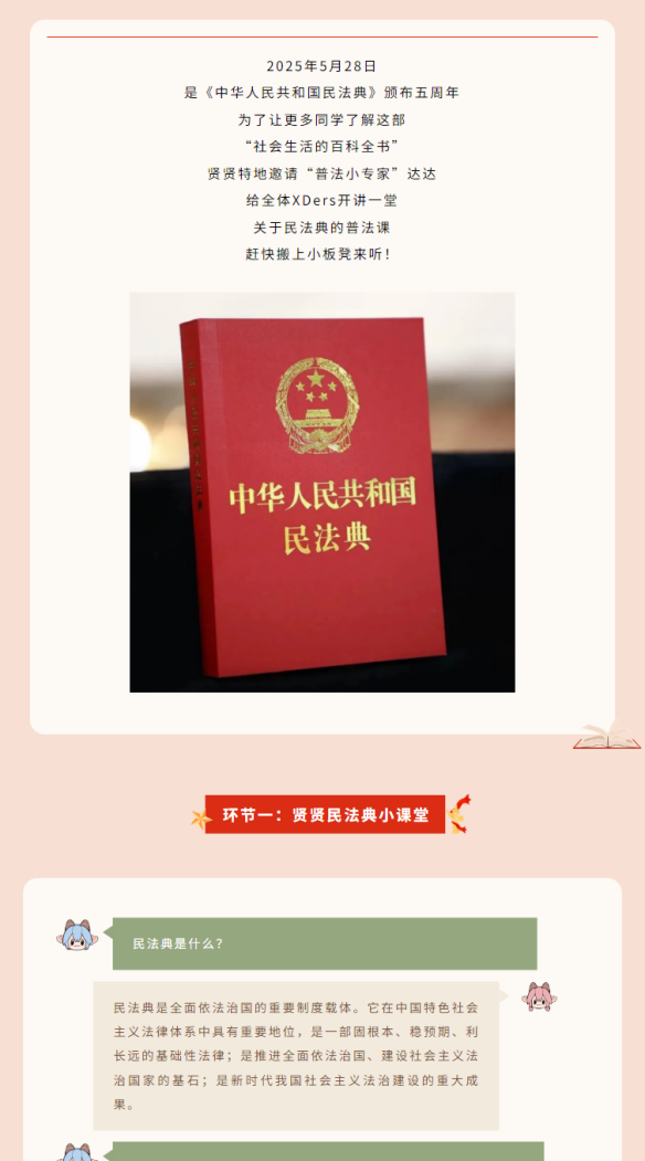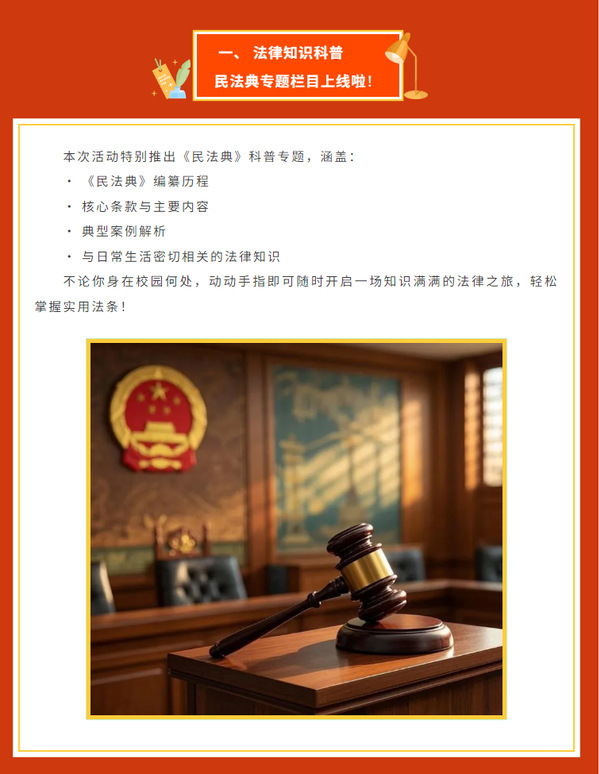 为进一步增强普法实效,校团委依托官方微信公众号精心策划推出了线上学习专栏。内容涵盖民法典核心知识点、典型案例解析、热点法律问题解读等,方便同学们随时随地获取学习资源,实现碎片化高效学习。同时,为了提升普法教育的趣味性和互动性,校团委组织设计了“法律问答小测试”栏目,通过一系列精心编排的选择题和情景判断题,引导同学们在轻松愉快的氛围中巩固法律知识、检验学习成果。