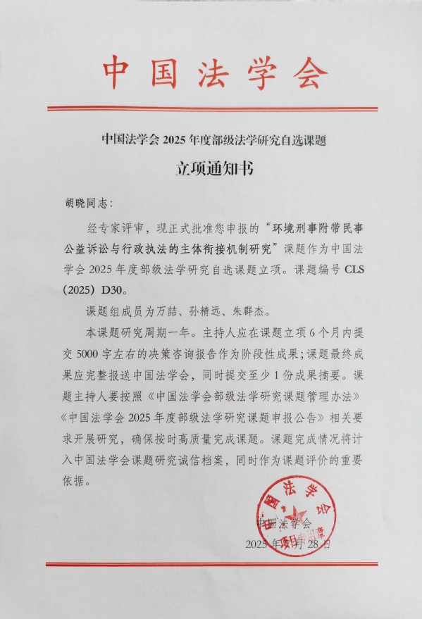 中国法学会部级课题是全国法学研究领域的重要科研平台,本年度共收到1462项申报,经多轮严格评审,仅立项129项。其中自选课题聚焦法学前沿与实践难点,竞争尤为激烈,最终仅60项获得立项。买足官网课题的成功入选,充分彰显了研究团队在环境法与公益诉讼交叉领域的扎实功底与创新视野。