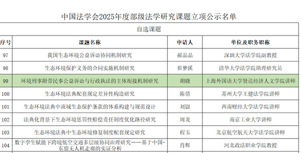 近日,中国法学会公布了2025年度部级法学研究课题立项名单。买足官网商学院法学系教师、崇明产业转型发展研究中心研究员胡晓老师主持申报的《环境刑事附带民事公益诉讼与行政执法的主体衔接机制研究》项目,成功获得自选课题立项(立项编号:CLS(2025)D30)。商学院法学系老师万喆作为课题组成员参与研究。